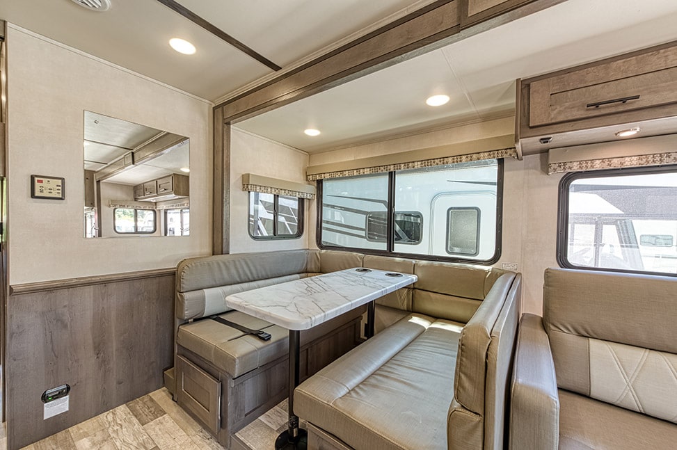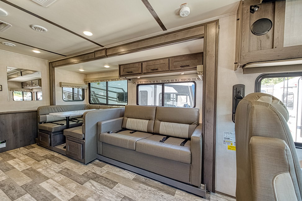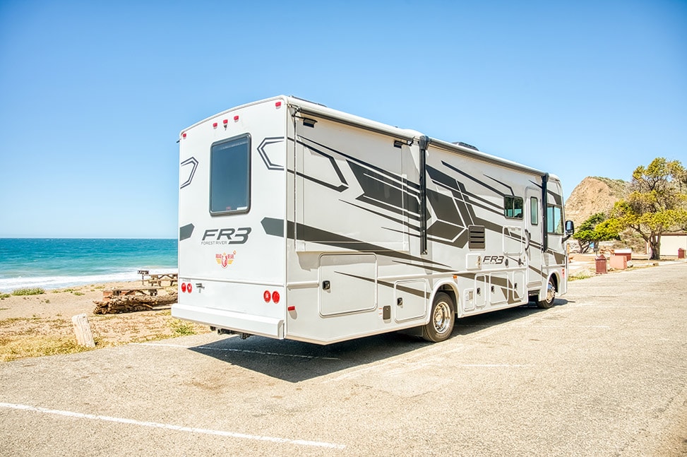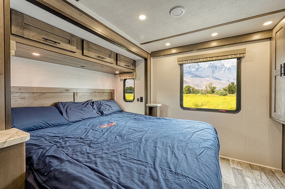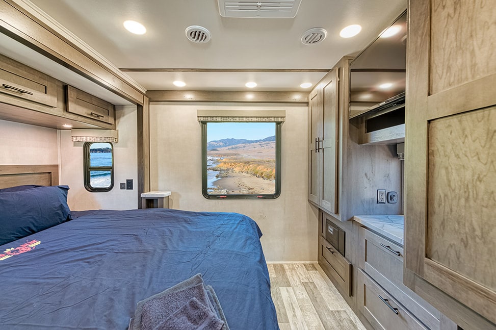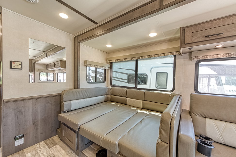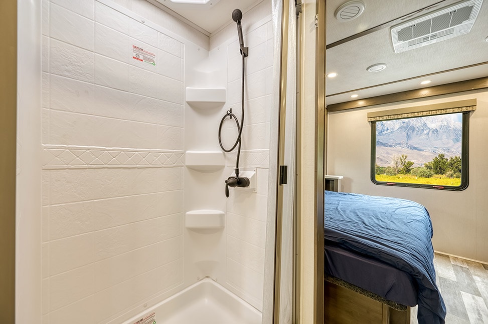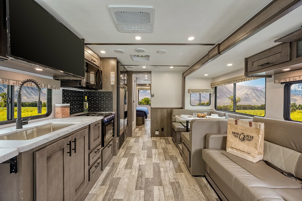Damit Sie sicher sind, verfügt das Wohnmobil über einen starken Ford V8-Motor mit einem Automatikgetriebe und einer Rückfahrkamera. Das macht es einfach zu fahren und zu wenden. Außerdem gibt es Waschbecken, Bäder (innen und außen), einen Ofen, einen Warmwasserbereiter, einen Herd, einen Backofen, eine Mikrowelle und einen Generator an Bord. Die Klimaanlage wird Sie kühl und frisch halten. Sie können die Seite des Wohnmobils ausziehen, wenn Sie tagsüber anhalten, um für den Abend noch mehr Platz im Inneren zu schaffen. Sie können draußen essen oder ein Buch lesen, während die Kinder spielen, denn die große Markise spendet Ihnen Schatten.