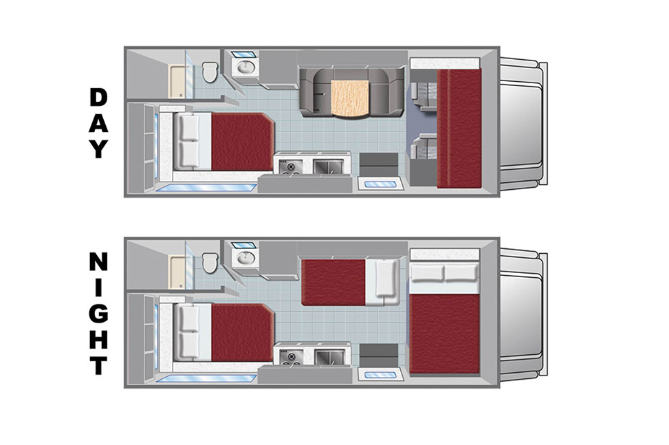 | Dormir | 4 adultes Cab over – 1.3m x 2.4m ((4′3″) x (7′10″)) Dinette – 1.1m x 1.8m ((3′7″) x (5′11″)) Permanent double – 1.4m x 1.9m ((4′7″) x (6′3″)) |