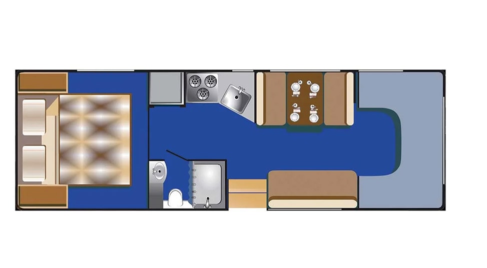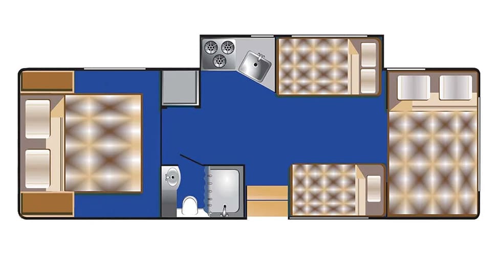 | Sleeps | 5 adults, 2 children Cab over – 1.4m x 2.4m ((4′7″) x (7′10″)) Dinette – 1.1m x 1.8m ((3′7″) x (5′11″)) Double – 1.4m x 2m ((4′7″) x (6′7″)) |